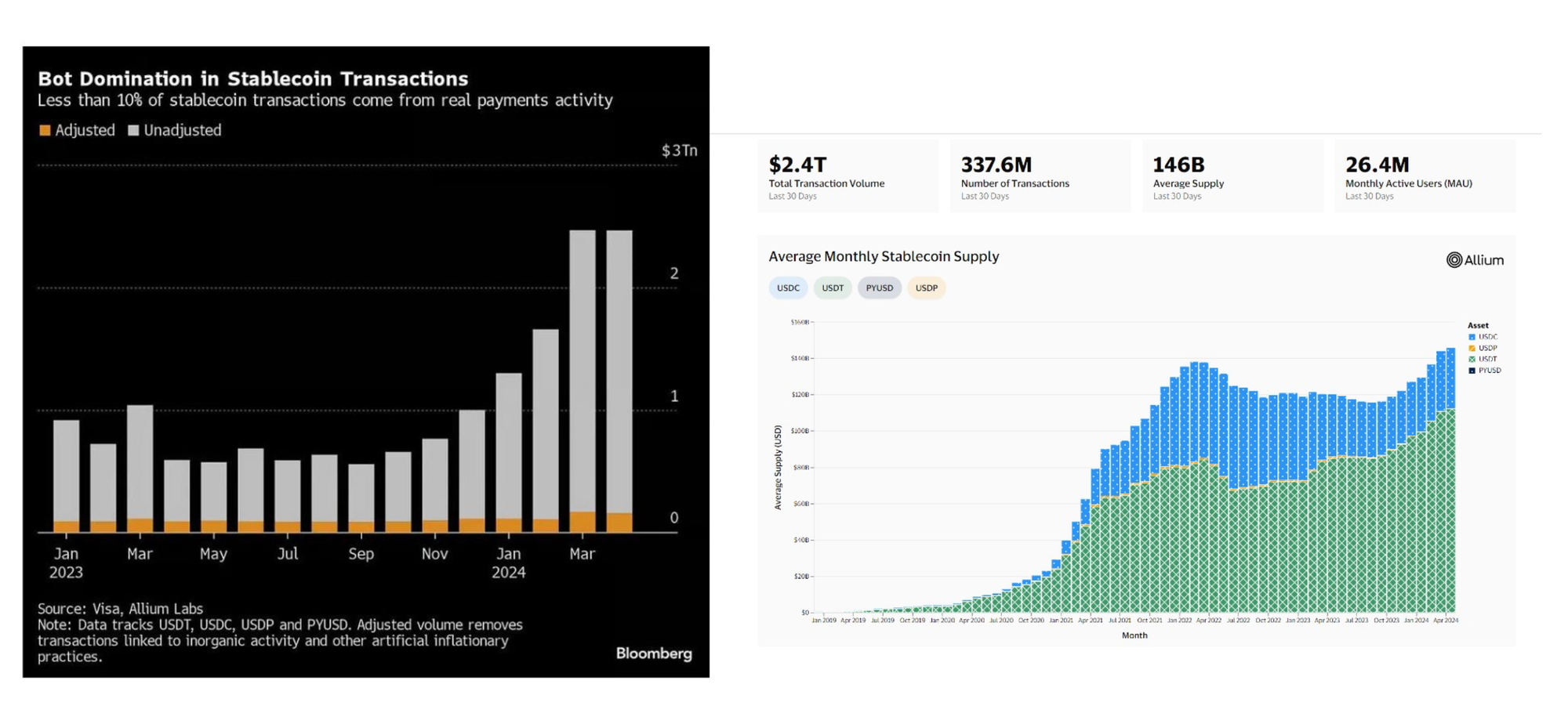 📉 More than 90% of stablecoin transaction volumes aren’t coming from genuine users, analysis co-developed by Visa finds, according to a Bloomberg report. Out of about $2.2 trillion in total transactions in April, just $149 billion originated from “organic payments activity."