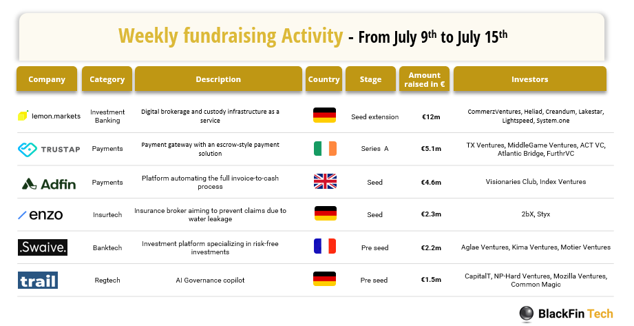 💰 Last week we saw 6 official FinTech deals in Europe for a total amount of €27.7m raised with 3 deals in Germany, 1 in the UK, 1 in Ireland, and 1 in France. Read the complete BlackFin Tech article here