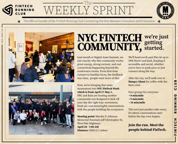🇺🇸 FinTech fanatics, this is where FinTech actually connects in NYC. FRC NYC with Pedro D'Avila x Rain are hosting a community run during NYC FinTech Week. 🏃➡️ April 28 · 7:00 AM Run 5KM from Marsha P. Johnson Memorial Fountain.
