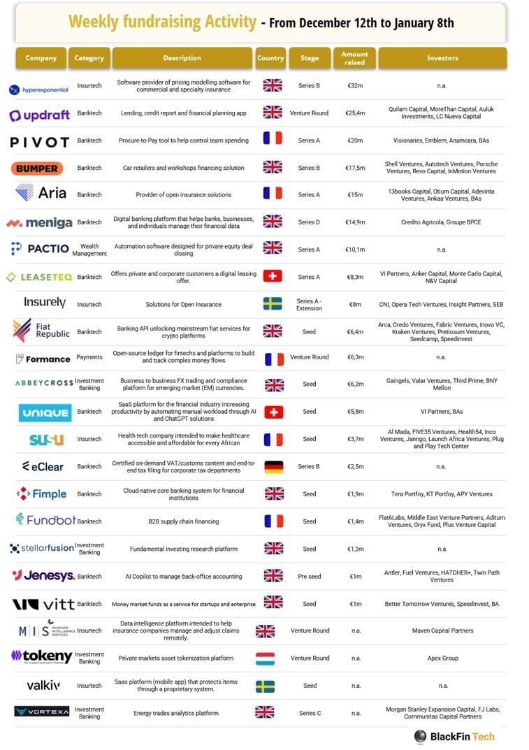🤑Since December 12th, we saw 24 deals in Europe for a total amount of €188.2m raised officially with thirteen deals in the UK, five in France, two in Sweden, two in Switzerland, one in Germany, and one in Luxembourg. Link here