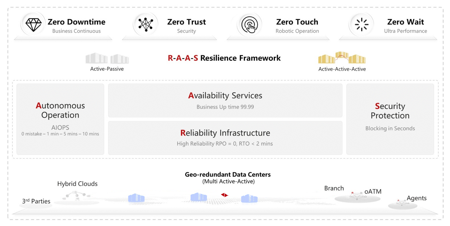 Central to Huawei’s infrastructure vision are the “4 Zeros” – four guarantees that redefine banking reliability. These are Zero Downtime, Zero Wait, Zero Trust, and Zero Touch. Even though the “4 Zeros” look straightforward, let’s have a look at what this actually means.