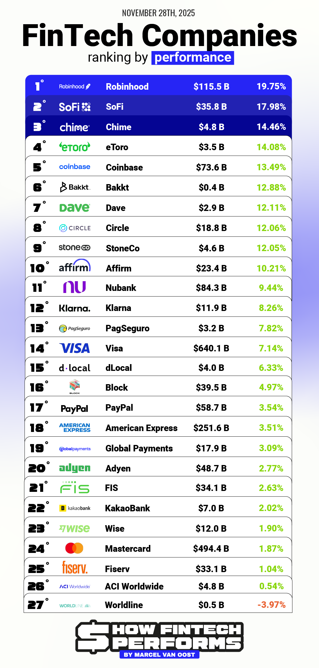 💰 FinTech Rebounds: Only One Player in the Red. 👇 Below is your full breakdown across market cap, performance, payments, digital banks, and crypto. Subscribe to my newsletter, How FinTech Performs, for more