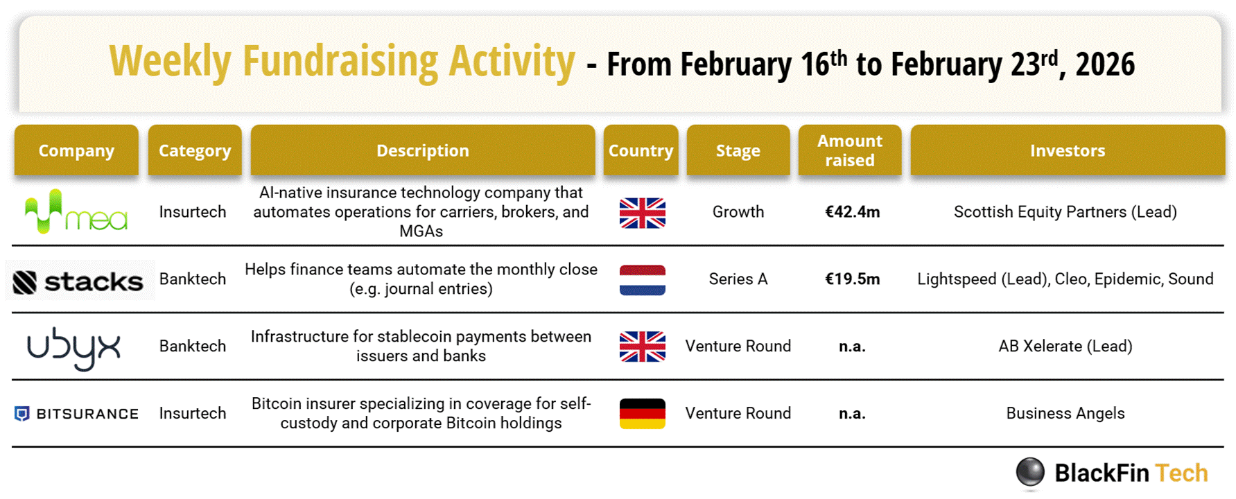 💰 Last week was somewhat quiet for European FinTech. There were four deals in Europe, totalling €61.9m in disclosed funding, including two transactions in the UK, one in the Netherlands, and one in Germany.