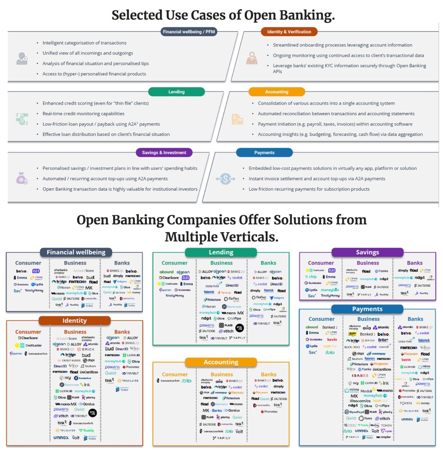Open Banking FinTechs offer solutions from multiple verticals to various end-user types: