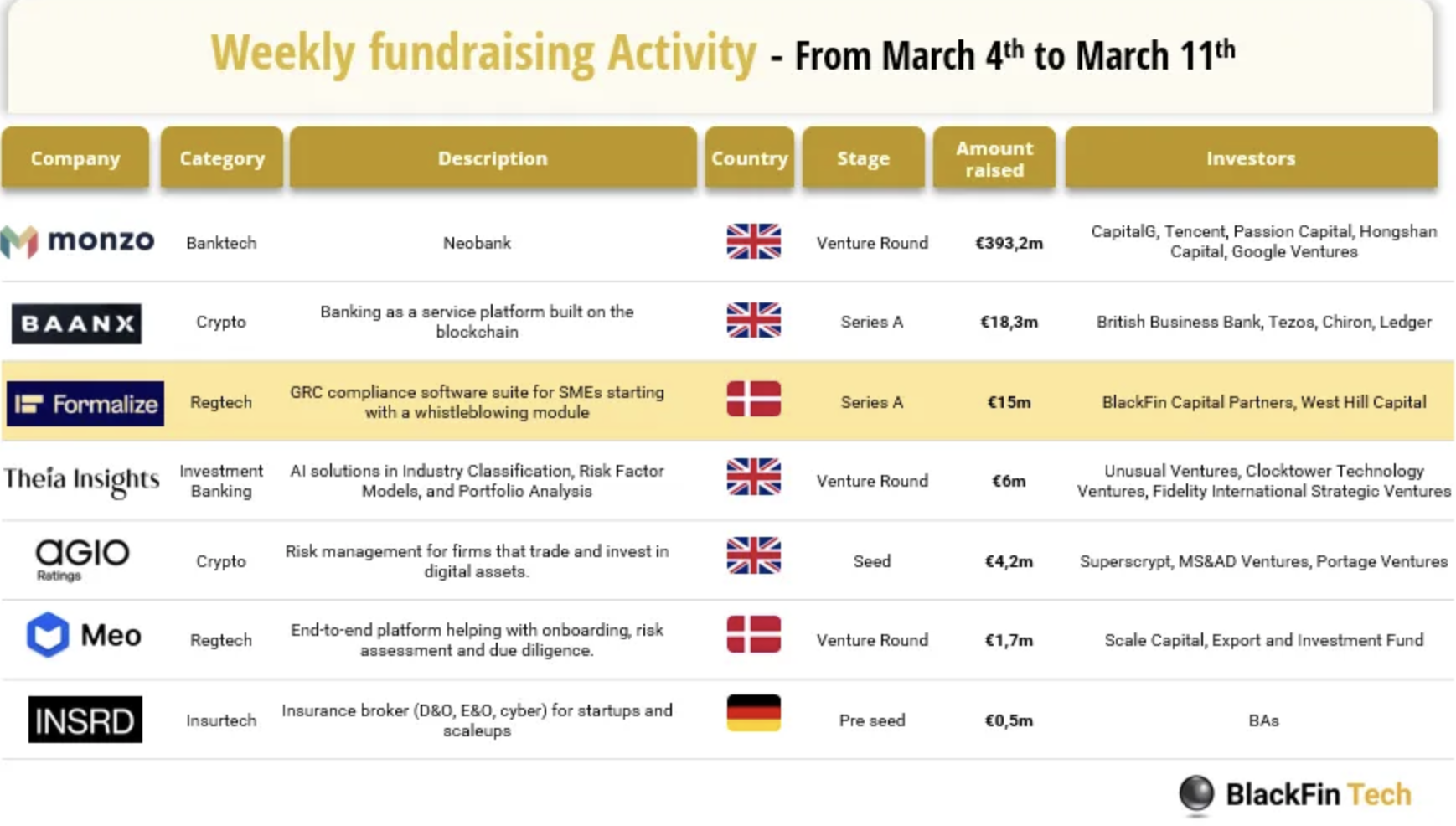 Last week we saw 7 official FinTech deals in Europe for a total amount of 438,9m€ raised with 4 deals in the UK, 2 in Denmark, and 1 in Germany. Read the complete Blackfin Tech article here