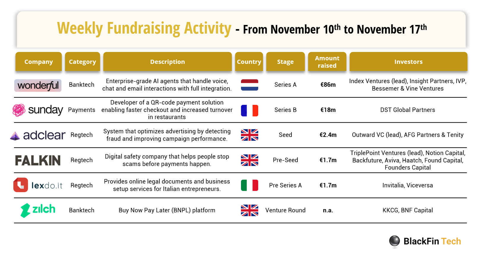 💰 Over the last week, there were six FinTech deals in Europe, raising a total of €110 million, including three transactions in the United Kingdom, one in France, one in the Netherlands, and one in Italy.
