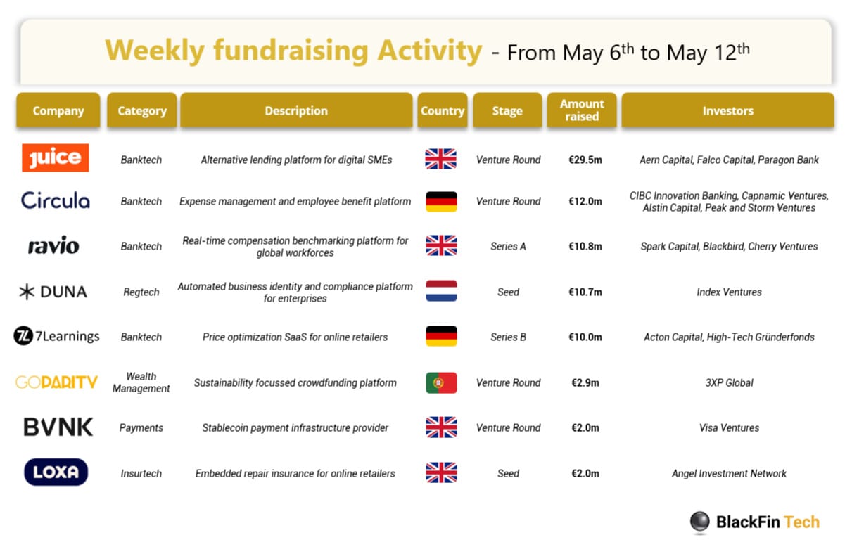 💰Over the last week, there were 8 FinTech deals in Europe, raising a total of €80.0 million in equity: four deals in the UK, two deals in Germany, and one deal in each of Portugal and the Netherlands.