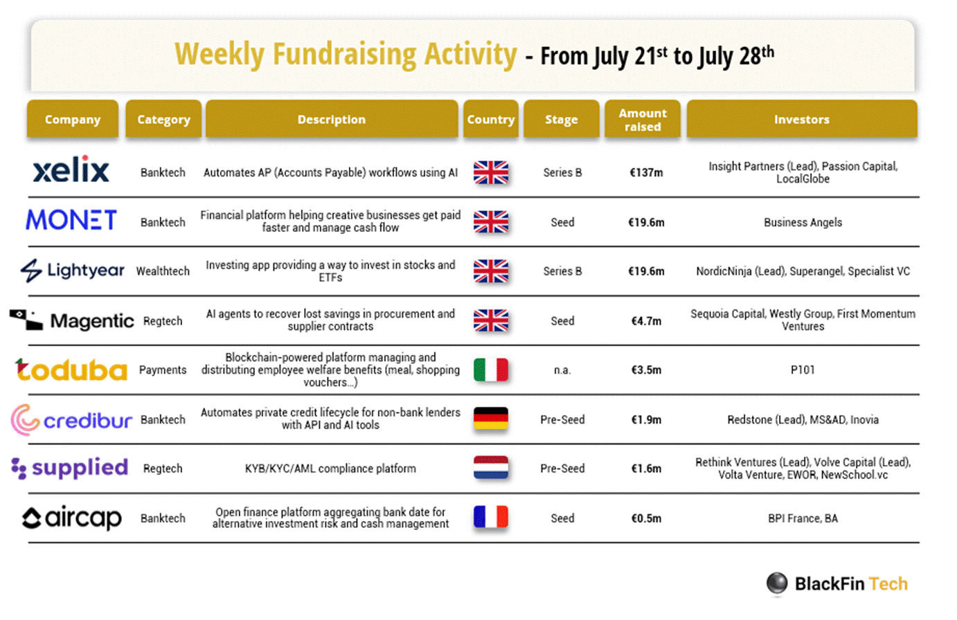 💰 Over the last week, there were eight FinTech deals in Europe, raising a total of €188 million, including four deals in the UK, and one each in France, Germany, Italy, and the Netherlands.