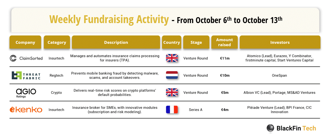 💰 Over the last week, there were four FinTech deals in Europe, raising a total of €31 million, including two transactions in the UK, one in France, and one in the Netherlands.