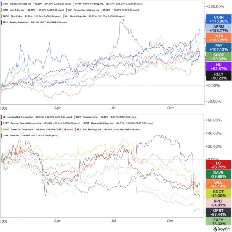 The 𝗕𝗲𝘀𝘁 and the 𝗪𝗼𝗿𝘀𝘁 performing FinTech stocks this year👇 Let's dive in:
