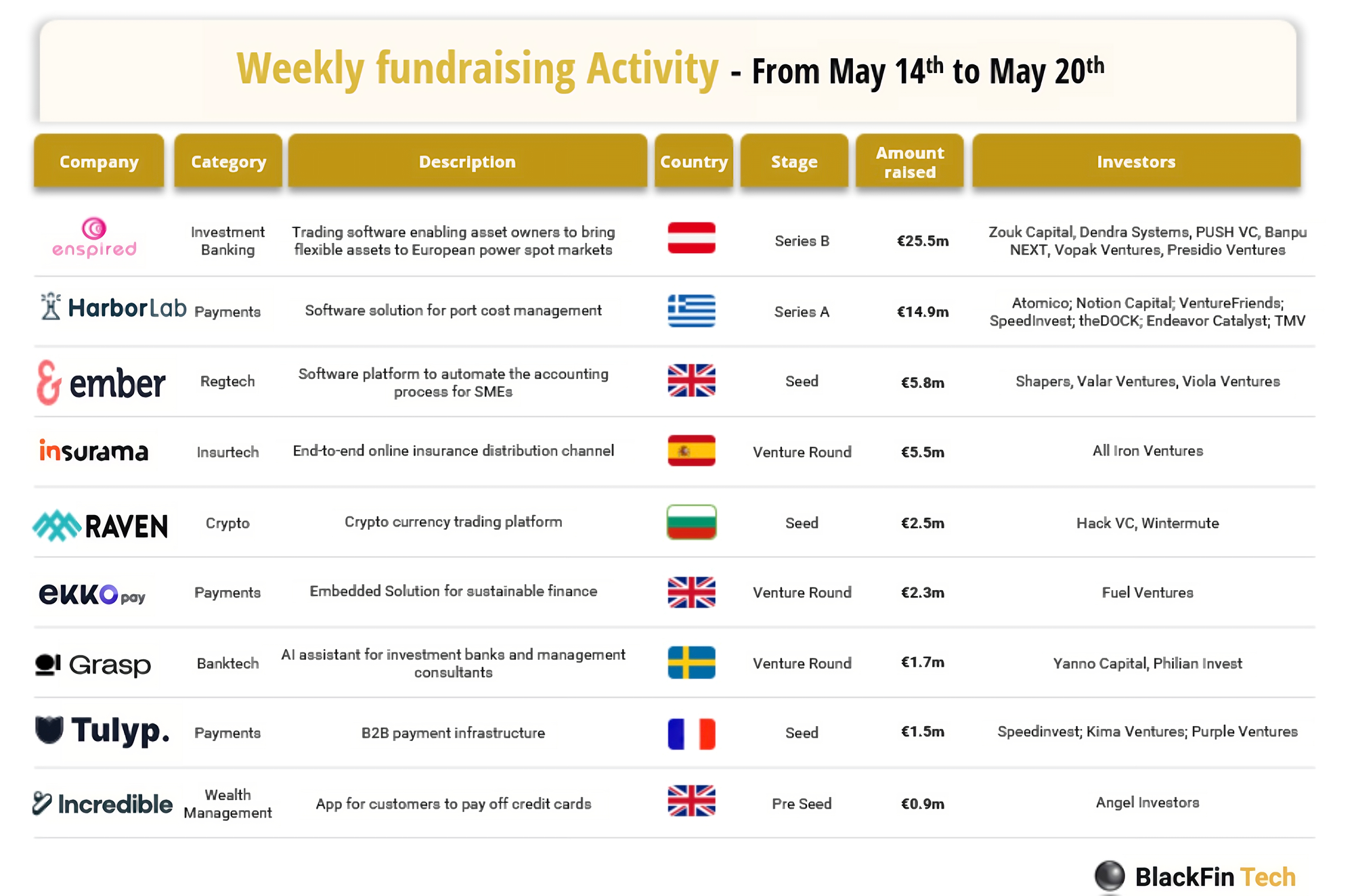 Last week we saw 8 official FinTech deals in Europe for a total amount of €58.1m raised with 3 deals in the UK, and 1 in Austria, Greece, Spain, Sweden, and France. A true European mix! Check out the complete BlackFin Tech article