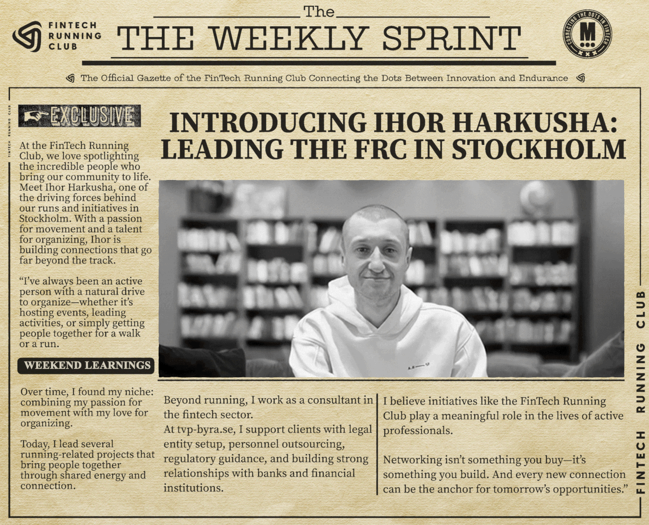 🌟Introducing Stockholm's Host! We're excited to share more about Ihor Harkusha, host to the FinTech Running Club family. 🙌 Get ready to run, connect, and grow the community together. 👉 Join the next run in Stockholm!