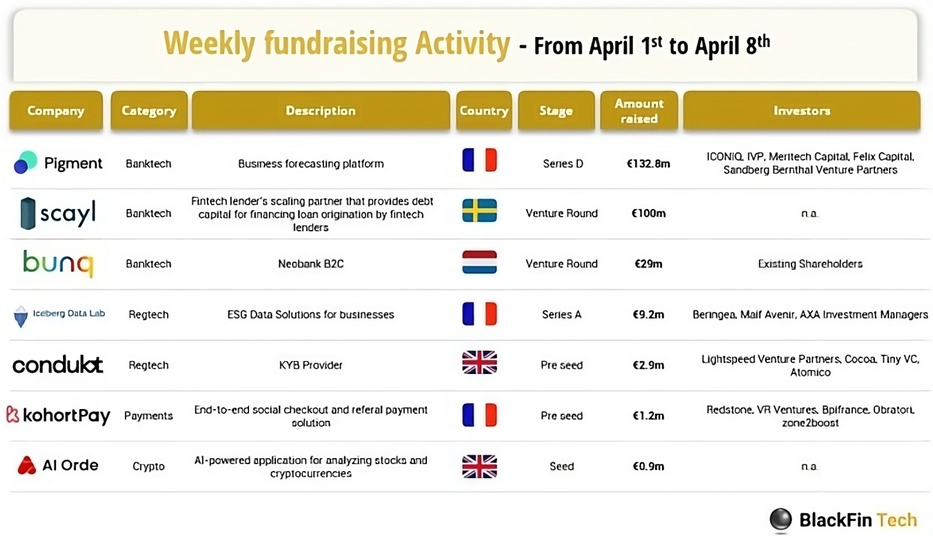 Last week we saw 7 official FinTech deals all over Europe for a total amount of 276m€ raised, with 3 deals in France, 2 in the UK, 1 in the Netherlands, and 1 in Sweden. Explore the complete BlackFin Tech article here