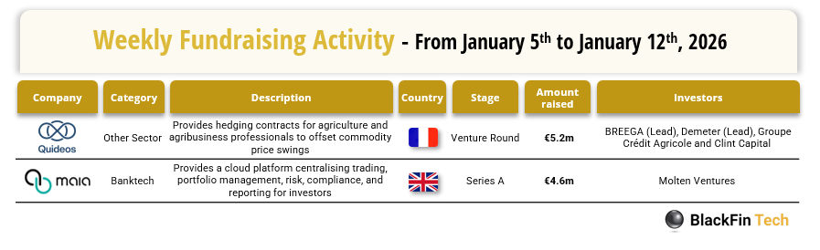 💰 Over the last week, there were two FinTech deals in Europe, raising a total of €9.8 million, including one transaction in France and one in the UK.