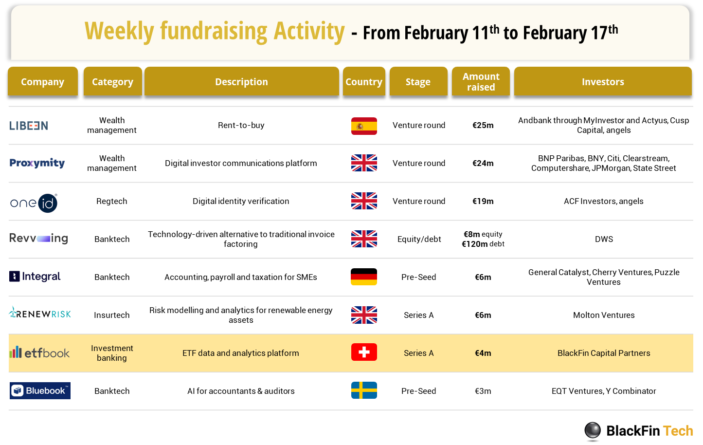 💰Over the last week, there were 8 FinTech deals in Europe, raising a total of €95 million in equity, 4 deals in the UK, as well as 1 deal in Switzerland, Germany, Sweden and Spain each.