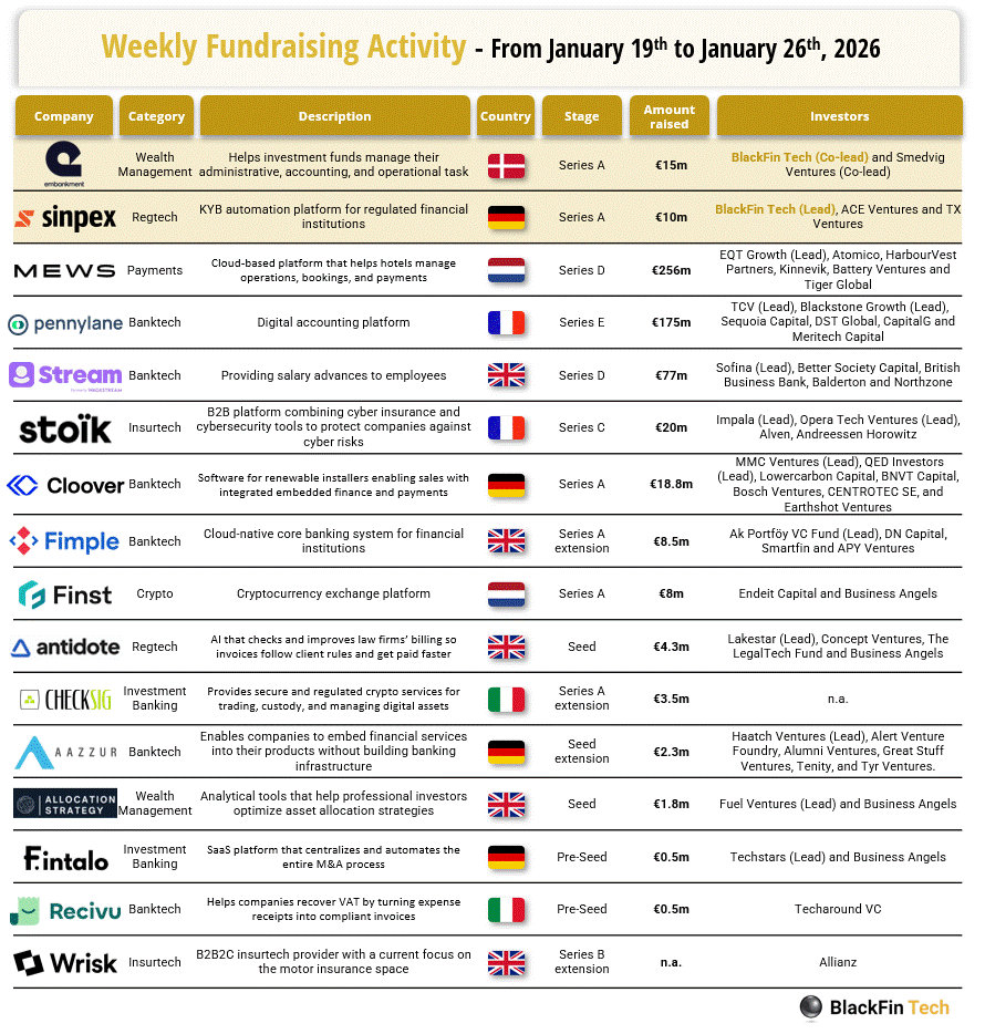 💰 Over the last week, there were sixteen FinTech deals in Europe, raising a total of €601.2 million, including four transactions in the UK, three in Germany, three in France, two in Italy, two in the Netherlands, and one each in Denmark and the Czech Republic.