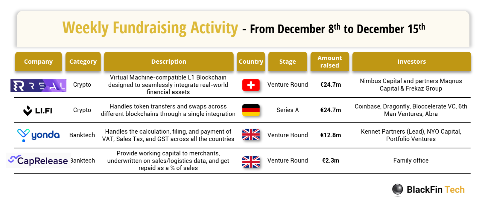 💰 Over the last week, there were four FinTech deals in Europe, raising a total of €64.5 million, including two transactions in the UK, one in Germany, and one in Switzerland.