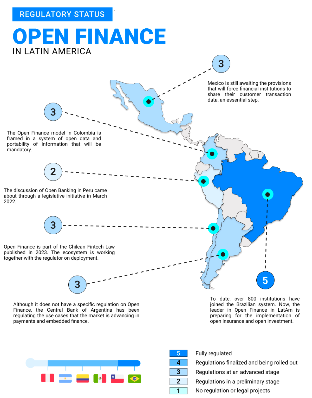 Open Finance in Latin America. In LatAm, the adoption of Open Finance varies significantly. Countries such as Brazil and Mexico are leading the way with advanced regulations, while others are still exploring their potential. Download the full report for further info.