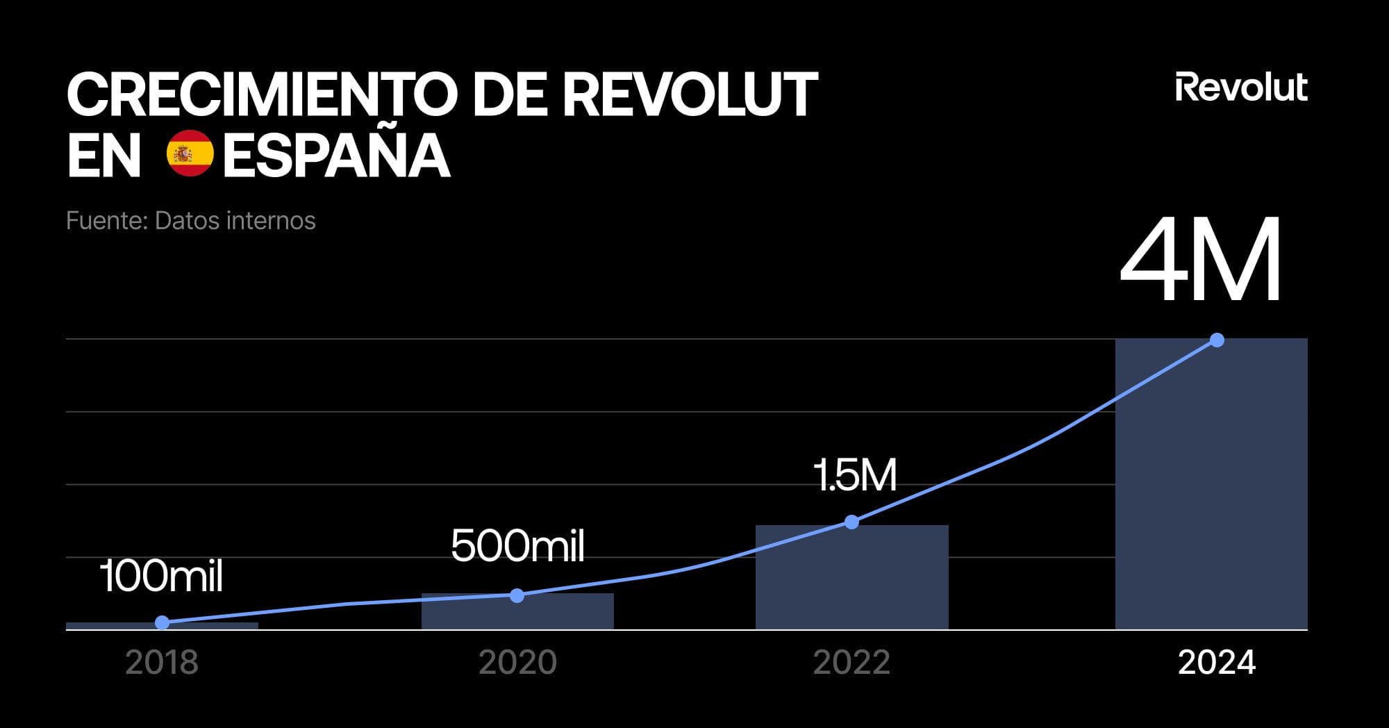 🇪🇸 Revolut just reached 4 million customers in Spain, an increase of 60% or about 1.5M over the year. About the same number as it managed to attract in the first 5 years in. Now Spain ranks as the 3rd fastest growing market for Revolut, behind the UK and France.