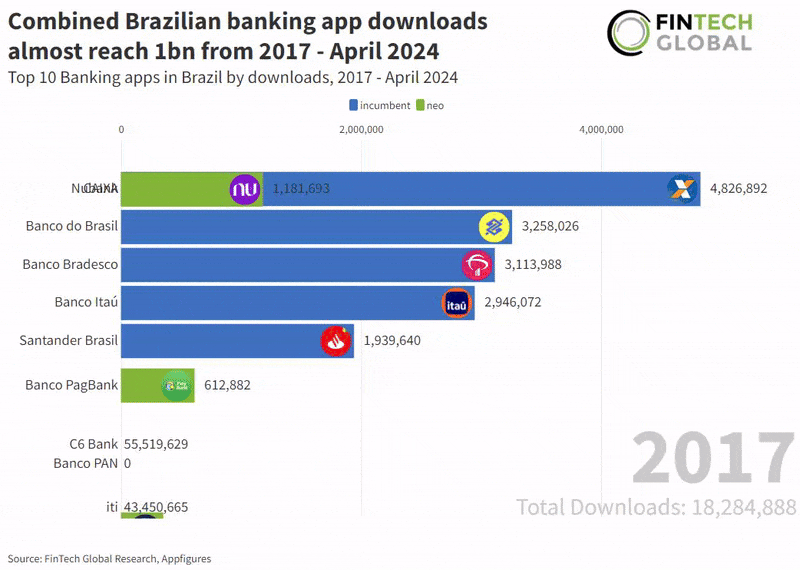 Combined Brazilian banking app downloads reached a total of 860m since January 2017 with incumbent banks having a slight edge over challengers with 441m installs, a 51% share.