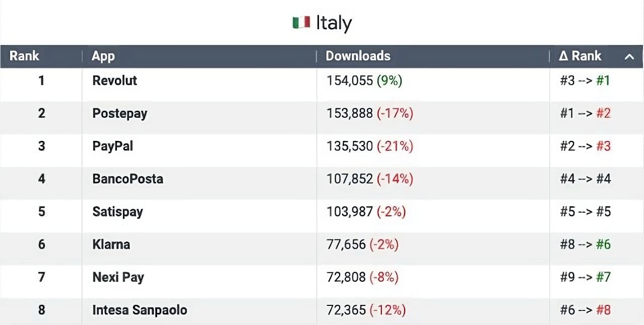 🇮🇹 Revolut has become the most downloaded financial app in Italy, surpassing local players like PostePay and Intesa Sanpaolo. They have acquired more than 300,000 customers (post-KYC) in the first four months of the year. This is an increase of +85% annually for the same period.
