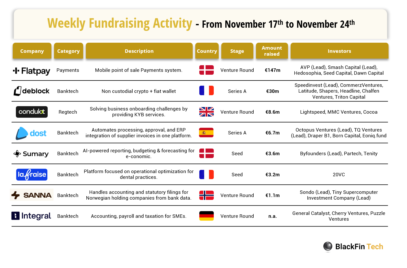 💰 Over the last week, there were eight FinTech deals in Europe, raising a total of €200 million, including two transactions each in France and Denmark and one each in the UK, Spain, Norway, and Germany.