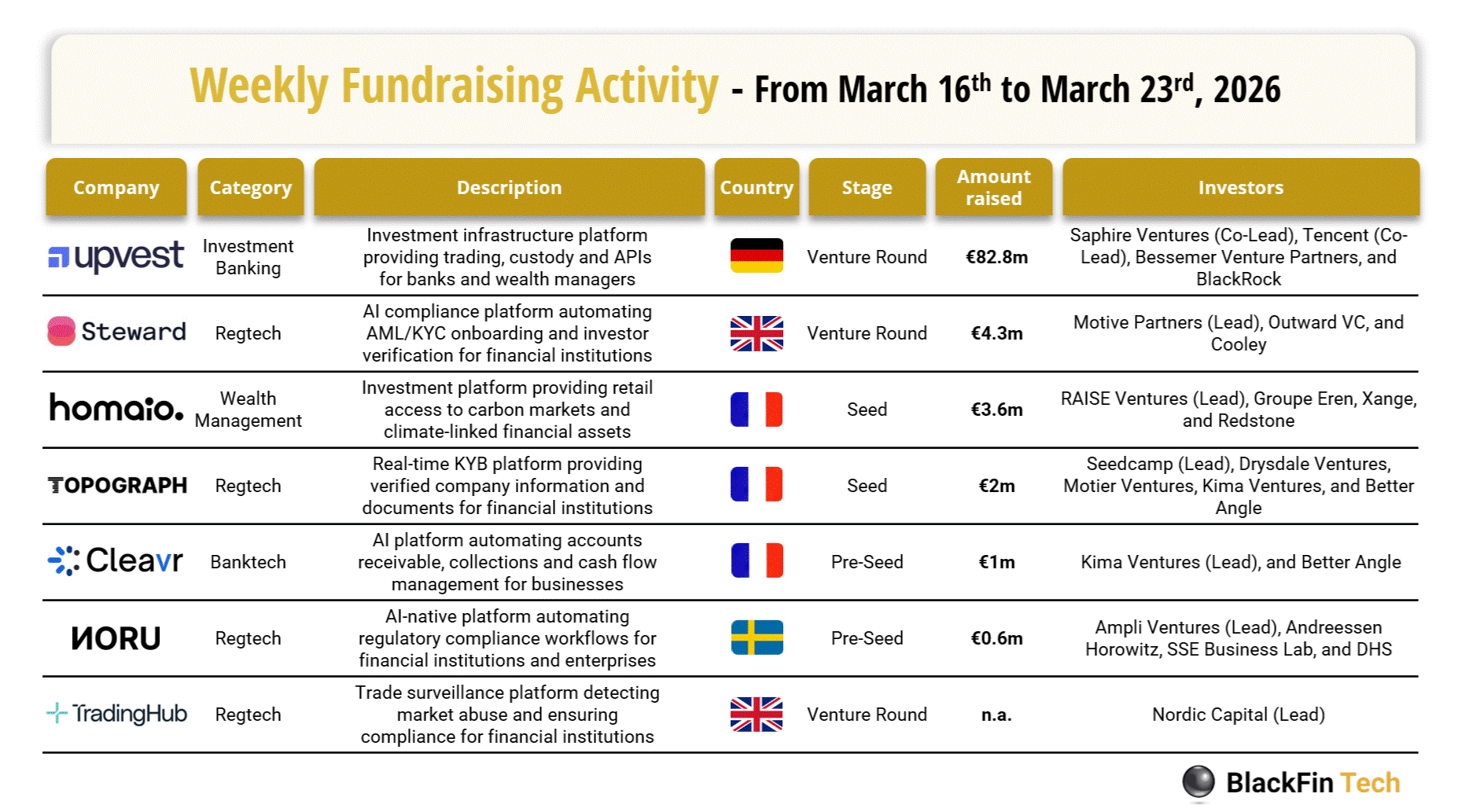 💰 Over the last week, there were seven FinTech deals in Europe, totaling €119.6m in disclosed funding, including three transactions in France, two in the UK, one in Sweden, and one in Germany.