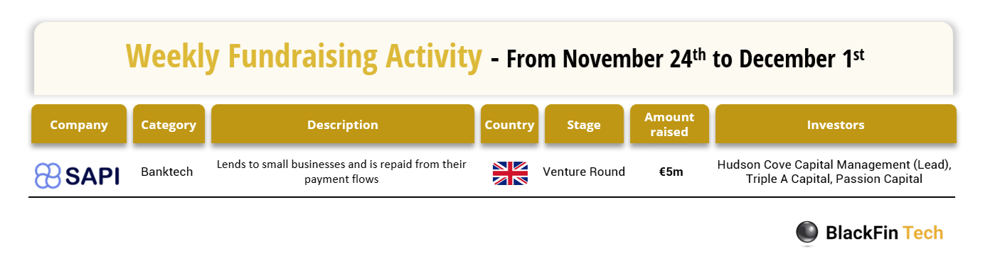 💰 Over the last week, there was one FinTech deal in Europe, raising €4.6m million, in the United Kingdom: Sapi, a UK-based payment-linked financing platform that enables payment providers to offer flexible funding to small businesses, has raised €4.6 million in equity.