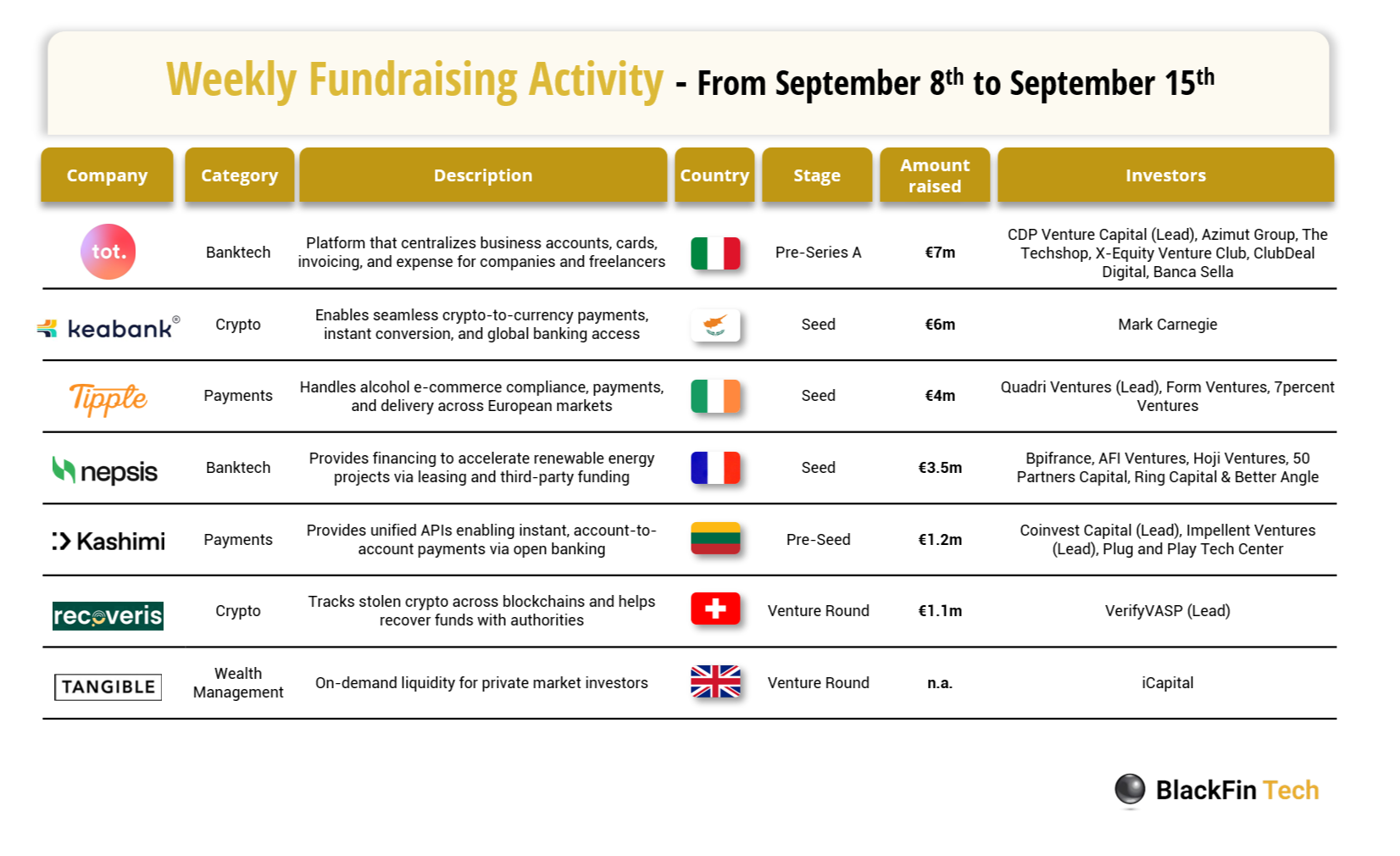 💰 Over the last week, there were seven FinTech deals in Europe, raising a total of €22.8 million, including transactions in Italy, Cyprus, Ireland, France, Lithuania, Switzerland, and the UK.
