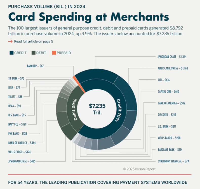 💰 The 100 largest issuers of general-purpose credit, debit, and prepaid cards generated $8.792 trillion in purchase volume in 2024 🤯