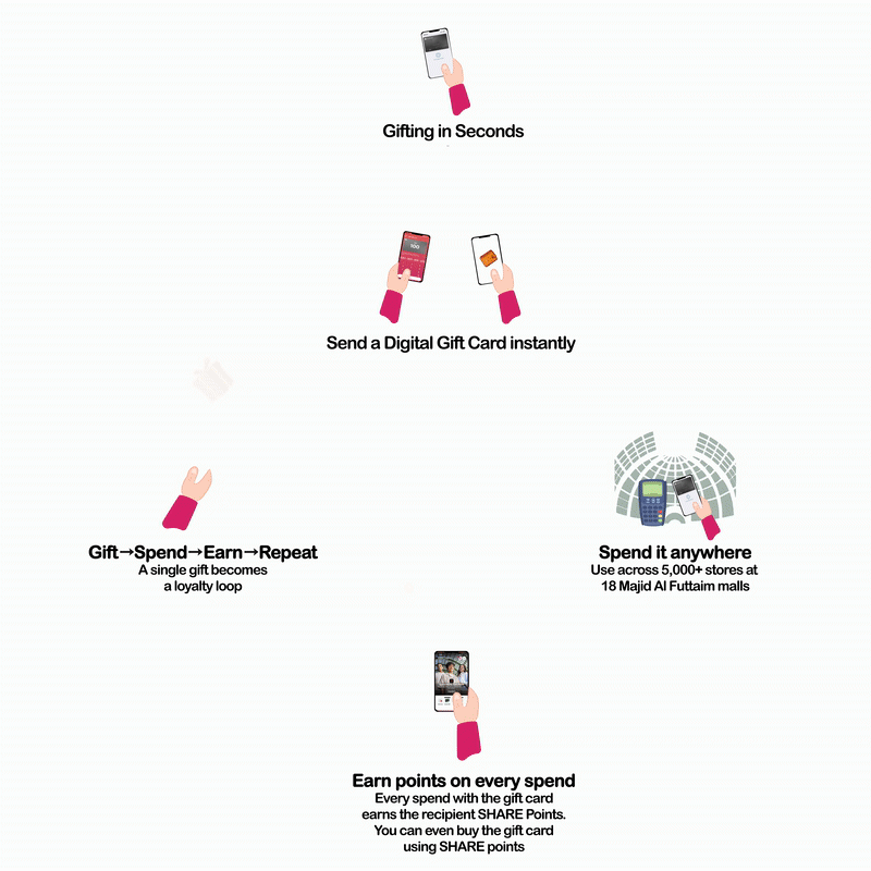 Majid Al Futtaim’s answer is an all-in-one digital gift card linked to the SHARE loyalty program. Think of it as an umbrella card for 5,000+ stores across 18 malls: premium brands (fashion, luxury, electronics), everyday essentials (groceries, department stores) and entertainment venues (cinema, theme parks). It can be purchased through the SHARE app, sent to the recipient, and instantly loaded into their Apple or Google wallet; the recipient simply taps or scans and pays like cash. And then, your giftee picks exactly what they want from any of these places.