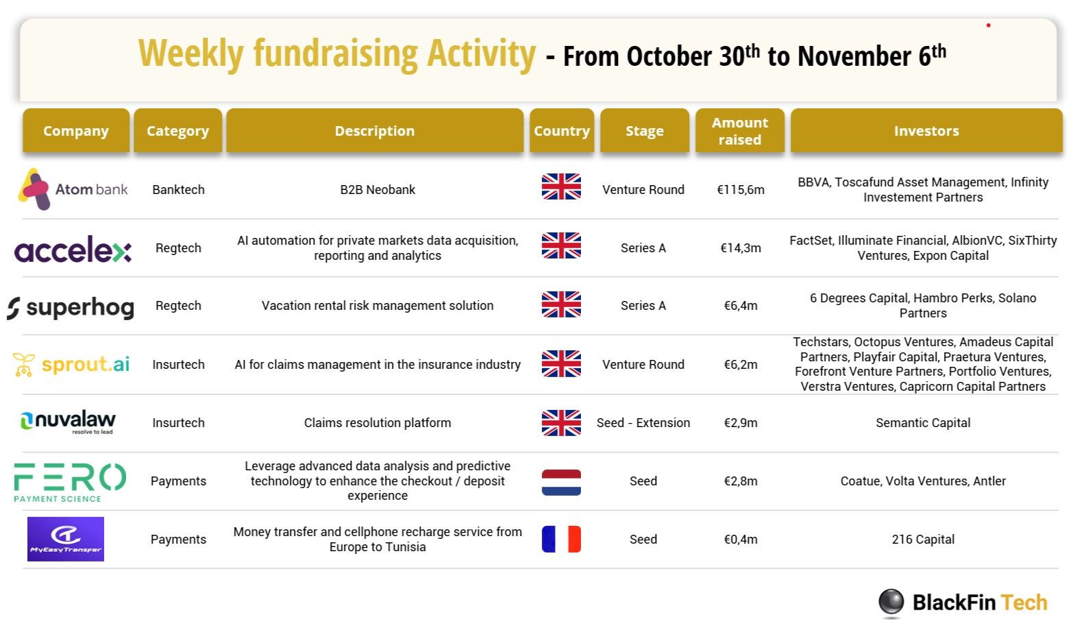 In the past week, we saw 7 FinTech deals in Europe for a total amount of €148.5m raised officially with five deals in the UK, one deal in The Netherlands, and one in France. Link here
