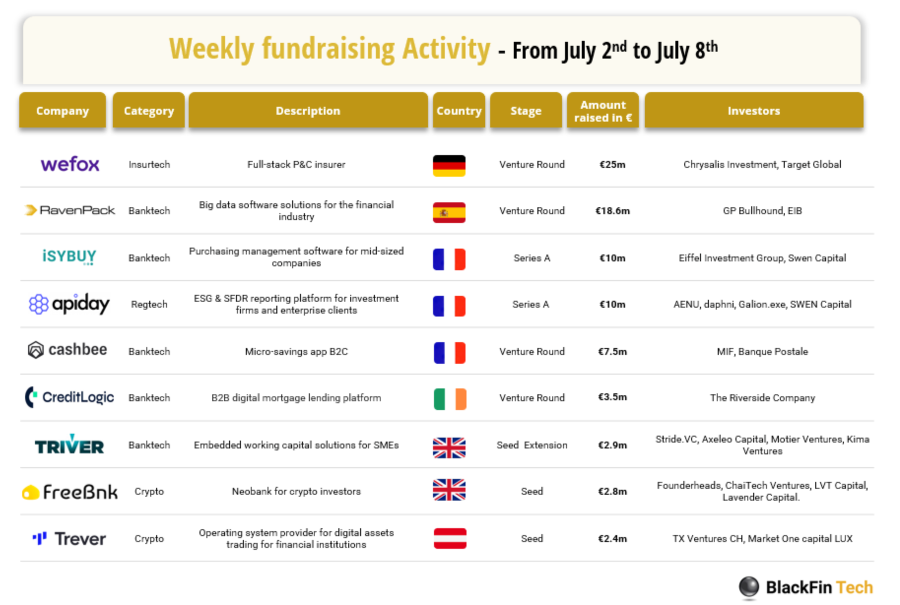 💰 Last week we saw 9 official FinTech deals in Europe for a total amount of €82.7m raised with 3 deals in France, 1 deal in the UK, 1 deal in Ireland, 1 deal in Germany, 1 deal in Spain, 1 deal in Lithuania and 1 deal in Austria. Read the complete BlackFin Tech article here